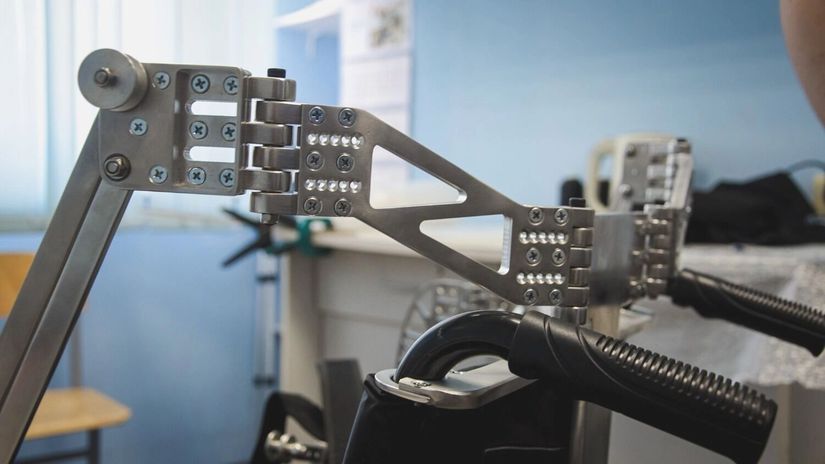 Конструкторские решения и впрямь оригинальные. Здесь отсутствуют сложные электрические элементы. Механизм работает за счет рычагов, подшипников и эластичных тяг, которые «отзеркаливают» мышцы, объясняет врач-педиатр, кандидат медицинских наук, главный конструктор Федор Андрющенко.