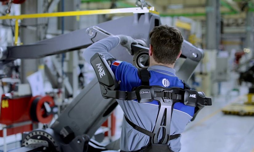 Mate от Comau — промышленный пассивный экзоскелет для верхних конечностей. Он использует механическую систему пружин и передач, которые распределяют часть веса рук на корпус, разгружая мышцы при поднятии и удержании рук над головой. Такая поддержка снижает нагрузку на мышцы плечевого пояса, улучшает осанку и облегчает выполнение статических задач. Устройство не требует ни батарей, ни мотора, но при этом повышает точность операций на 27 % и ускоряет их на 10 %.