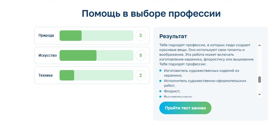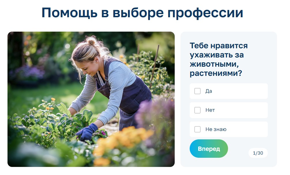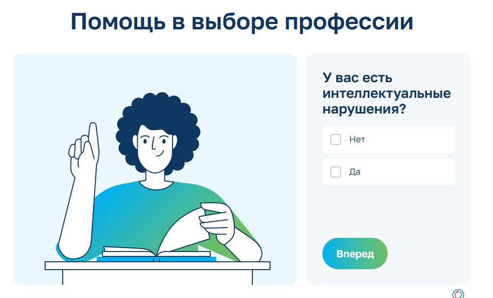 Раздел «Помощь в выборе профессии» предлагает пройти специализированные профориентационные методики, учитывающие особенности лиц с интеллектуальными нарушениями и без них. Это позволяет подобрать наиболее подходящие профессии и подготовить человека к успешной профессиональной реализации.