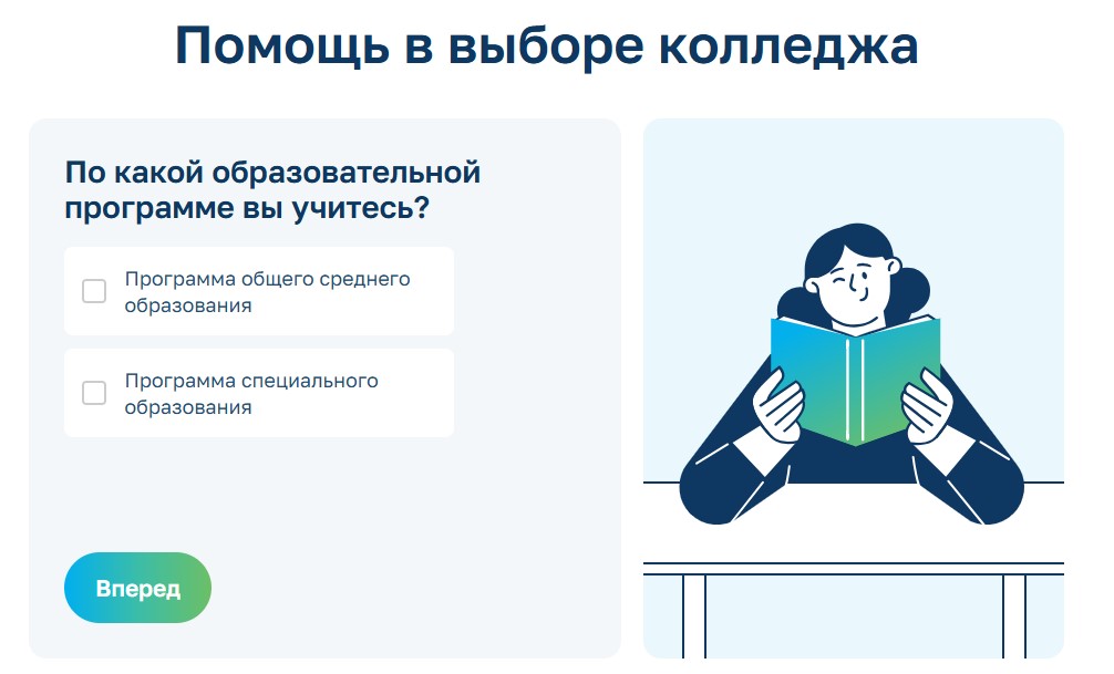 Для тех, кто уже определился с выбором профессии или образовательной траекторией, раздел «Помощь в выборе колледжа» предлагает различные профессиональные маршруты в зависимости от типа образовательной программы — общего среднего или специального образования.