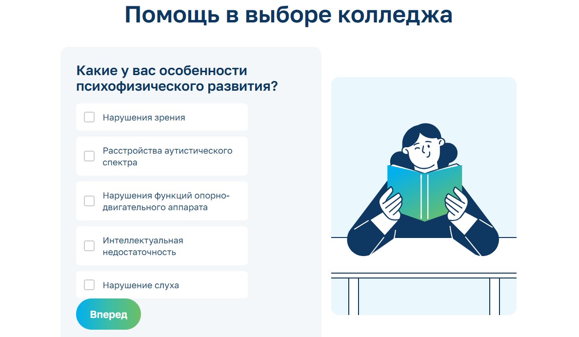 Раздел «Образовательные возможности» представлен полным перечнем колледжей и вузов, а также интерактивным путеводителем по системе профессионального образования. Для удобства поступающих созданы карты — как для всех желающих, так и специально для лиц с особыми потребностями, что значительно упрощает процесс выбора учебного заведения.